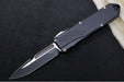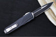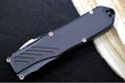 This knife combines resilience with a sleek, tactical aesthetic, featuring a MagnaCut steel blade. The Recon-035 G2 Double-Action Automatic has an overall length of 8 inches and a closed length of 4.50 inches. Its 3.375-inch fine-edge spear-point blade showcases a striking all-black finish, complemented by an all-black Type III Hardcoat Anodized Aluminum handle. The handle, approximately 7/16 inches thick, features milled traction slots and jimping for a secure grip. The thumb slide rides on a stainless steel plate with ceramic balls to reduce friction. All hardware is finish matched, and the knife includes a reversible pocket clip for tip-down carry, along with a lanyard hole for added versatility.