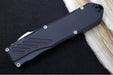 This knife combines resilience with a sleek, tactical aesthetic, featuring a MagnaCut steel blade. The Recon-035 G2 Double-Action Automatic has an overall length of 8 inches and a closed length of 4.50 inches. Its 3.375-inch fine-edge spear-point blade showcases a striking all-black finish, complemented by an all-black Type III Hardcoat Anodized Aluminum handle. The handle, approximately 7/16 inches thick, features milled traction slots and jimping for a secure grip. The thumb slide rides on a stainless steel plate with ceramic balls to reduce friction. All hardware is finish matched, and the knife includes a reversible pocket clip for tip-down carry, along with a lanyard hole for added versatility.