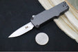 This H&K Micro Incursion has a grey aluminum handle with a stonewashed clip point blade in 154CM steel.