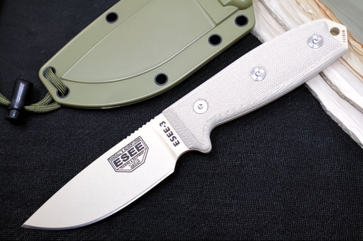 View full detailsEsee Knives Model 3 - Tan Canvas Micarta Handle / 1095 Steel / Tan Textured Powdered Blade / OD Green Molded Polymer Sheath 3P-DT