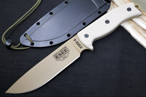View full detailsEsee Knives Model 6 - Tan Canvas Micarta Handle / 1095 Steel / Tan Textured Powdered Blade / Black Molded Polymer Sheath 6P-DE
