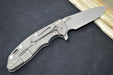 This is the ultimate in "Gray Man" blades. The handle is a grey G10 with a tumbled gray titanium frame. The Blade is what is called a "working finish". The finish is gray as well. This gives the knife a very unobtrusive appearance. Not flashy at all...
