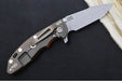 This is the ultimate in "Gray Man" blades. The handle is a Orange G-10 with a tumbled Battle Bronze titanium frame. The Blade is what is called a "working finish". The finish is gray as well this gives the knife a very unobtrusive appearance. Not flashy at all...