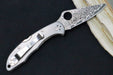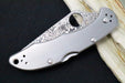 To complement the dramatic blade of this Delica, the handle is precision machined from solid 6AL-4V titanium. The titanium scales are precision machined and bead blasted to a handsome grey finish. They are supported by a stainless steel back spacer and mated to the blade by a high-strength back lock mechanism. Extra touches of class include a stainless steel liner tube in the lanyard hole and a polished stainless steel clip configurable for left or right-side tip-up or tip-down carry.