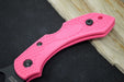 This Dragonfly 2 has a pink FRN handle, black hardware, and a black leaf shaped blade in CPM-S30V.