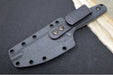 This Schwarz Knives Confidante has black canvas micarta handle scales, Magnacut steel with a sheepsfoot/bushcrafting blade with a OD Green Cerakote, and a black kydex sheath.