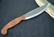 In keeping with the same theme as his first design through TOPS (the Little Bugger). It's thin with TOPS'; modified Scandi grind, a tumble finish and tan canvas Micarta handle scales. This one comes with a deep carry brown leather sheath that Matt designed based off some old Native American styles of sheath. It is meant to ride cross-draw, underneath the belt, towards the back side of the wearer.