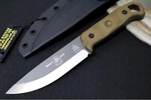 View full detailsTops Brakimo Fixed Blade - 1095 Steel / Green Canvas Micarta Handle / Black Kydex Sheath BRAK-02