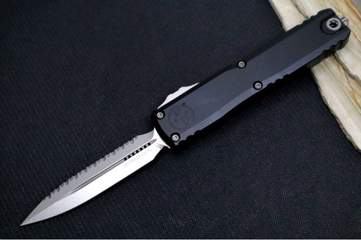 View full detailsMicrotech Ultratech Gen IV OTF - Stonewash Finish / Fully Serrated Dagger Blade / Black Anodized Aluminum Handle 11224-12