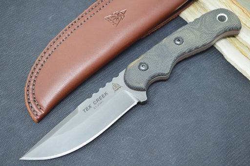 Tops Tex Creek - 1095 Steel / Black Canvas Micarta Handle / Brown Leather Sheath TEX-4