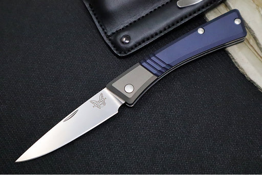 View full detailsBenchmade 315 Successor - M390 Steel / Spearpoint Blade/ Satin Finish / Crater Blue Anodized Aluminum & Ash Grey Aluminum Bolsters