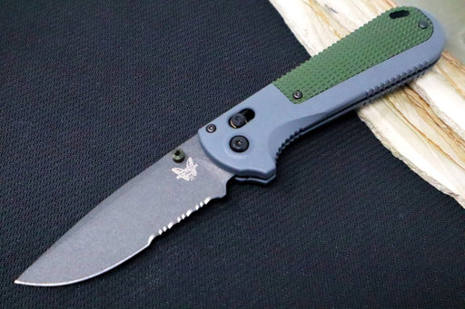 View full detailsBenchmade 430SBK Redoubt - Drop Point with Partial Serrate / Cobalt Black Finish / Grey & Green Grivory Handles