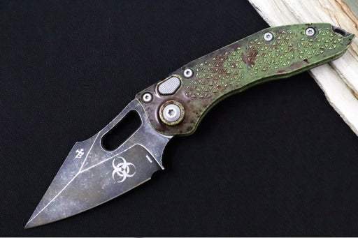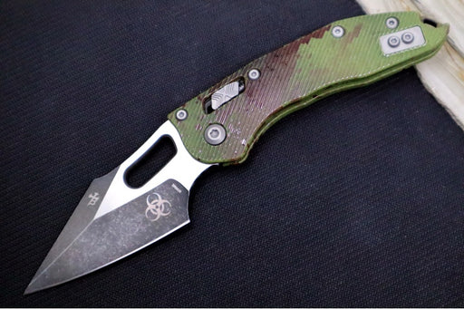 View full detailsMicrotech Stitch Auto Outbreak - Wharncliffe Blade / Darkwash Outbreak Finish / Outbreak Green Anodized Aluminum with Blood Splatter 169-1OBS