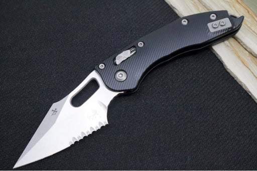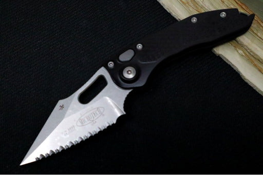 View full detailsMicrotech Stitch Auto - Wharncliffe Stonewashed Blade with Partial Serrate / Black Textured Milled Aluminum Handle 169-11