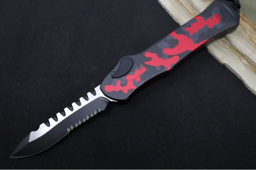 View full detailsHeretic Knives Hydra Single Action OTF - Two-Toned Black Recurve Blade with Partial Serrate / CPM-Magnacut Steel / Red Camo Anodized Aluminum Handle H008-10B-RCAMO