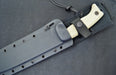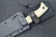 This Junglas has canvas micarta handle scales, black textured powder coated drop point blade in 1095, and a black kydex sheath.