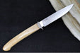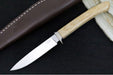 The drop point blade, featuring a full-flat grind and satin finish, offers precision slicing with effortless ease while exuding a sleek and refined appearance. Designed by the renowned Gianluigi “Wilson” Simonella, a master knifemaker and founding member of the Italian Knifemakers' Corporation (CIC), the Ago is a shining example of functionality paired with aesthetics. Its solid handle, offered in exquisite materials like green canvas Micarta, is ergonomically shaped for comfort, ensuring a secure grip for a myriad of tasks—from intricate detailing to heavier cutting needs. The sophisticated titanium ring nut/bolster not only enhances its visual appeal but also provides essential safety features. At just 1.34 ounces, this lightweight fixed blade comes with a stylish brown leather sheath, making it a convenient and elegant companion for any setting—be it urban or outdoor adventures.