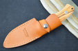 This M3 fixed blade has a satin Niolox blade, drop point blade style, Olive Wood handle, and a brown leather sheath.