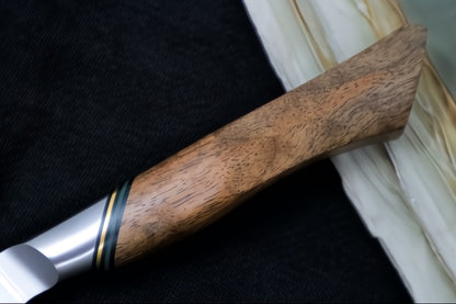 The blade features a 3-layer steel with a renowned Aus-10 steel core, celebrated globally for its exceptional performance. With a hardness rating of 60 HRC, it not only allows for effortless sharpening when necessary but also withstands the rigors of demanding kitchen tasks. Enhanced by a vacuum treatment process, this steel boasts remarkable durability. The edge is expertly sharpened to 15° on each side, ensuring that regaining its sharpness is a breeze. The handle, crafted from beautifully stabilized walnut wood, further enhances the knife's appeal, gaining added hardness through our proprietary vacuum treatment process.