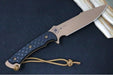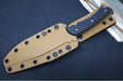 This Horkos has a FDE PVD coated blade with black micarta textured handle and a tan kydex retention sheath.