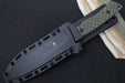This Machai is a black powder coated blade with green micarta textured handle and a black injection molded retention sheath.